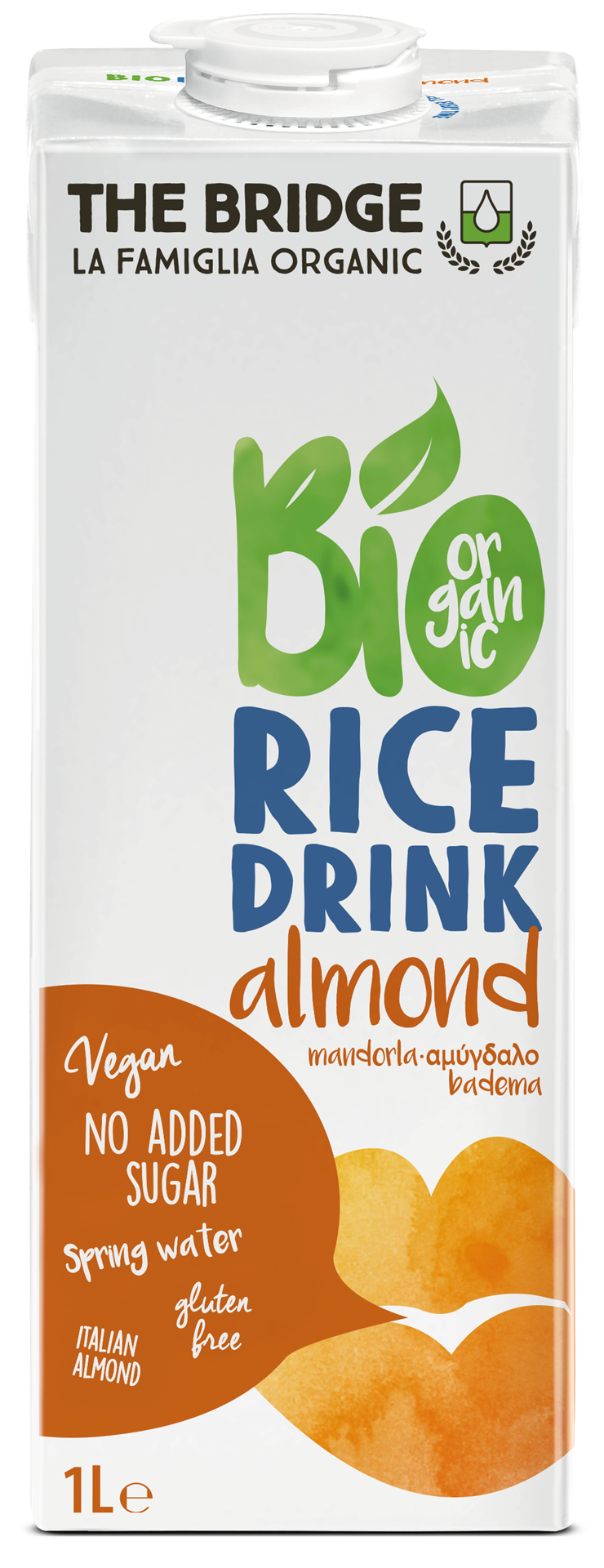 Napój ryżowy z migdałami marki The Bridge to ekologiczna, roślinna alternatywa dla MLEKA, łącząca naturalną słodycz włoskiego ryżu z szlachetnym aromatem sycylijskich migdałów.