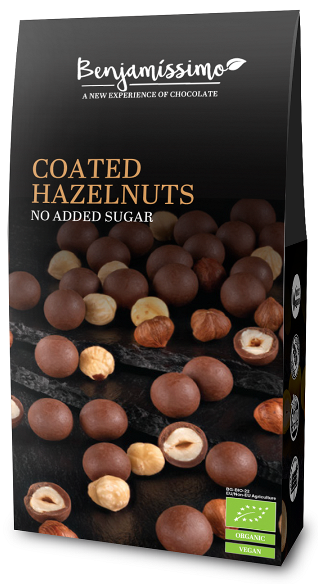 ORZECHY LASKOWE W CZEKOLADZIE PRALINOWEJ BEZ DODATKU CUKRÓW BEZGLUTENOWE BIO 60 g – BENJAMISSIMO