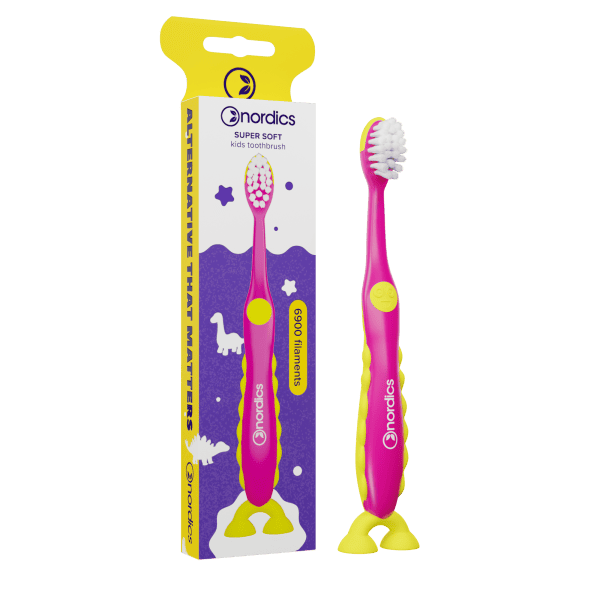 SZCZOTECZKA DO ZĘBÓW DLA DZIECI 6900 SUPER MIĘKKA RÓŻOWO – ŻÓŁTA DINOZAUR – NORDICS