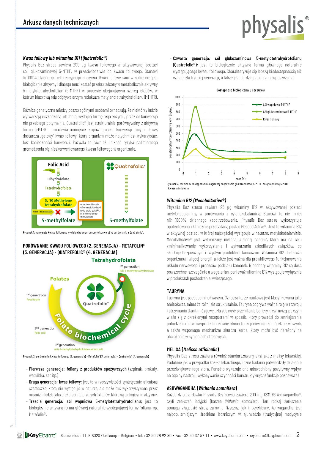 Physalis No Stress to naturalny i kompletny kompleks zawierający wszystkie kluczowe witaminy z grupy B i magnez, które przyczyniają się do zachowania zdrowego układu nerwowego. Magnez dodatkowo pomaga zmniejszyć zmęczenie. Wykazano, że ekstrakt z melisy lekarskiej przyczynia się do relaksu i zdrowego snu. Zawiera również Lactium®, naturalny produkt pochodzący z MLEKA, którego działanie zostało pozytywnie potwierdzone badaniami naukowymi. Indyjski żeń-szeń (KSM-66 Ashwagandha®), znany z Ajurwedy, pomaga w sytuacjach stresowych (zarówno fizycznych, jak i psychicznych). Ten kompleks zawiera również ekstrakt z Scutellaria baicalensis (Scutell’up®) o klinicznie udowodnionej skuteczności. Uzupełniony tauryną!